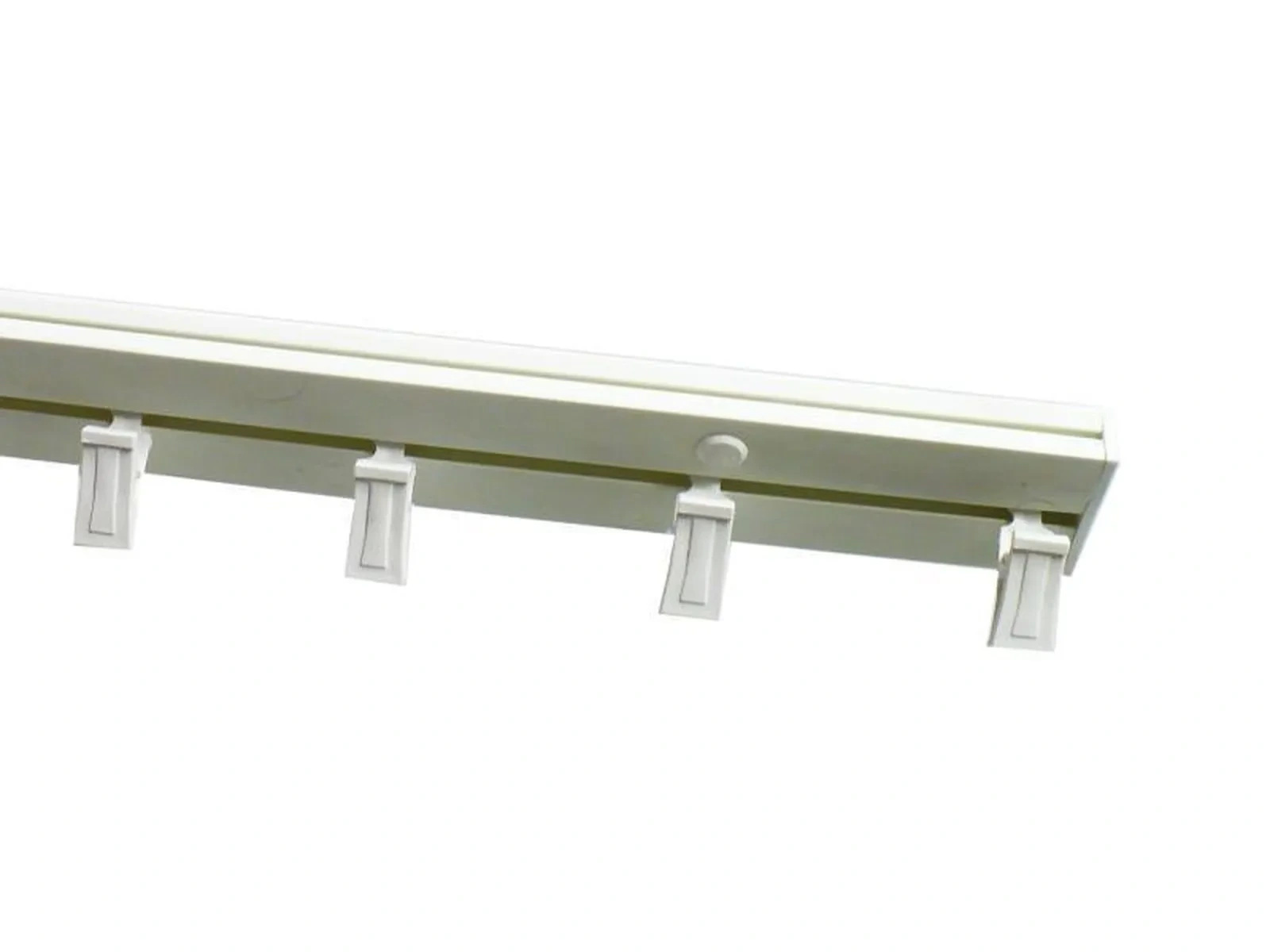 Plastová garniža jednodrážková, háčiky alebo štipce - 1 ks na 100 mm dĺžky, 2x koncová záslepka, záslepky otvorov, hmoždinky a skrutky.